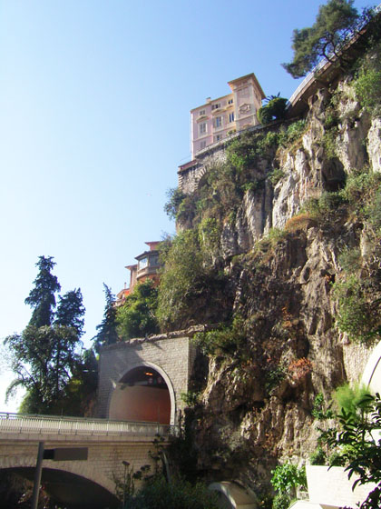 先前提到摩納哥是個生活空間垂直發展,與天爭地的小國,在沿岸有限的平地使用完之後,就將連綿的高山一座座鑿空,除了像香港一樣,沿著山坡地蓋滿了高樓住宅,他們更耗費了大量人力物力,開鑿了許多山洞,並將每個山洞用現代化的建築技術,例如柏油路、樓梯甚至電梯連貫起來,置身於蒙地卡羅市區,由於舉目所見,各種設施都十分的現代化,會讓人察覺不出自己正在某個山洞中,只覺得到處都是現代感十足、內裝華麗的高樓建築,公共空間的庭園造景和設施也都令人賞心悅目,所有的地下通道也都乾淨整齊、一塵不染,兩旁牆面掛著燈箱廣告,類似的景致在很多現代化的大都會都看過,只是在蒙地卡羅,三不五時就要走著上坡路或下坡路、要爬蜿蜒陡峭的