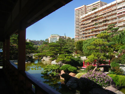 首站參觀位於港口邊的丘陵上,豪宅雲集當中座落著的日本庭園,在這個遙遠的西方國度,居然可以找到傳統東方的庭園造景,讓我覺得相當新奇,尤其是一月分剛在東京待了10天,看了許多和式的寺廟及庭園,居然在歐洲也出現了類似的景致,旅伴先前有上網查了摩納哥的歷史人文,跟我解釋是因為有許多日本人在歐洲經商,當中有不少因而致富,於是有樣學樣,也學歐洲富豪們在此置產,而民族性強烈的日本人,也不忘利用雄厚財力,除了支助摩納哥政府發展各項建設,因勢利導,也選購了這塊地,將家鄉的景致原封不動的搬來,好做為思鄉之處,更可藉此向其他各國炫耀日本在歐洲的財力和地位了。