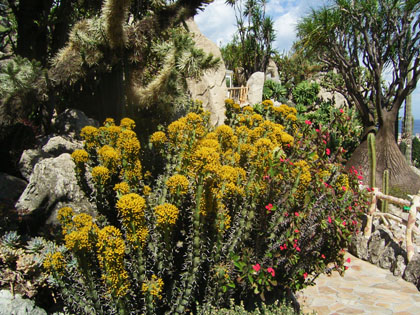 摩納哥國家植物園,是個處處令人充滿驚奇的地方,整個園區面積十分遼闊,同時分區規劃,每個區種植著來自不同熱帶區域的植物,由於這個植物園主要展示熱帶地區諸如中亞、東南亞、中南美洲、非洲的植物,因此放眼望去,到處遍布著奇形怪狀、無以名之的花花草草,接連不斷的視覺衝擊,霎時只感到眼花瞭亂,所有植物,包括花草、樹木、果實,全是前所未見的型態,或是印象中雖有見過,但從未看見如此巨大、完整的實體,走在園中,映入眼簾的盡是直徑超過一公尺的球形仙人掌,數個叢生在岩石上,佈滿著駭人的長針,再不就是數層樓高的棒狀仙人掌,像個巨人般俯視著其下的遊客,有的灌木長著金針狀的黃色葉子、有的長的像是香蕉狀的果實,有的葉緣像是鋸子、有的葉緣佈滿著虯結扭曲的針狀物有的植物花朵果實色彩斑斕美麗、有的像群聚的麵包蟲般其醜無比,還有太多無以名狀的奇特品種,難以道盡。