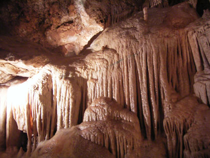 植物園中還有個深達百餘公尺的石灰岩洞,定時開放參觀,洞穴中有許多完整的石灰岩地形和鐘乳石,在燈光的照射下雖然十分陰暗,但特殊的景緻沖淡了伴著黑暗而來的陰森感;洞穴中也十分寂靜,在大家停下腳步聽導覽員解說時,除了可聽見清楚的回音外,也不時傳來水滴聲,地面十分潮濕,大小不一的鐘乳石分布在四周,大的比人還高,多成椎狀,有的經萬年累積演變,已變成上下相連的石柱,小的比成人指頭還細,往往抬頭一望,就看見洞穴上佈滿了數千數萬支小鐘乳石,像是長了毛一般,讓人看了起雞皮疙瘩;旅伴從未看過鐘乳石洞,在一邊嘖嘖稱奇的同時,也邊拿著他的數位單眼猛拍,寂靜的洞內頓時充滿了快門聲,甚至拍到其餘遊客都準備離開了還意猶未盡,最後導覽人員似乎有點不耐煩,仍強裝著笑意恭恭敬敬請我們離開,洞穴要關閉了,我們才從洞穴深層慢慢走回洞口,沿途非常的累人,也沒料到要走出一百多公尺深的岩洞,居然如此耗費力氣。